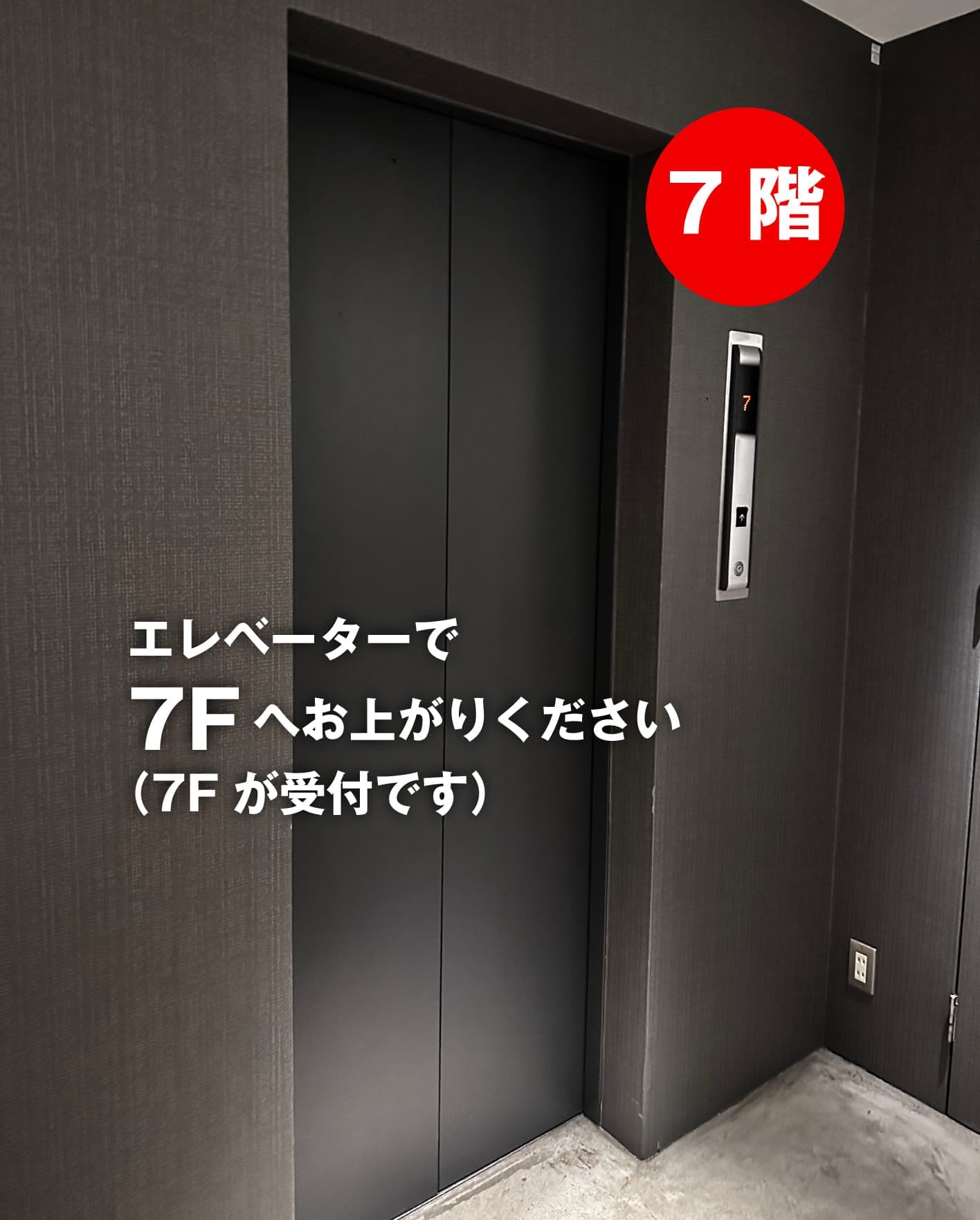 当日は7Fが受付となります。ホテルエントランス1Fよりエレベーターで7階までお上がりください。